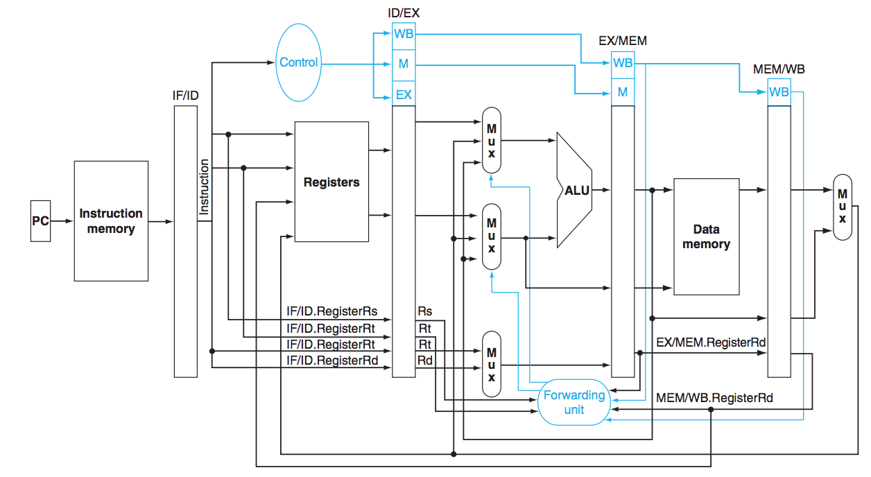 对于上面提到的第一条和第二条指令关于$2寄存器的数据冒险符合1.1条件。$2寄存器是sub指令的EX阶段的目标寄存器,同时是and指令在EX阶段需要使用的源寄存器。对于sub指令来说,EX段后$2寄存器的内容就已经在寄存器中了,如果我们新建一条数据通路,EX段ALU的源操作数可以直接数据通路中获取,那么1.1的数据冒险就可以解决。这就需要引入旁路控制单元。