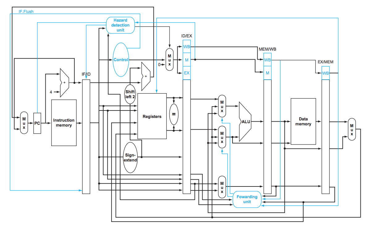 实际上,如果需要阻塞流水线的话,仅需要将ID/EX流水线寄存器中的RegWrite和MemWrite信号置为0就可以。