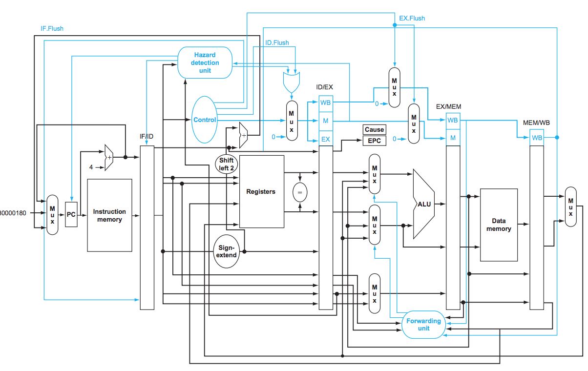实际上,异常可以看作是另一种形式的控制冒险。如果产生异常,我们也需要阻塞流水线,所以控制单元新增ID.flush信号,和冒险检测单元的输出相或决定是否清理ID级指令。此外新增EX.flush来清理EX级指令。这里我们假设使用状态寄存器来处理异常,异常处理地址是8000018016,所以PC的多选器新增异常处理地址的输入。图6是调整后的数据通路,新增刷新信号和PC多选器输入,图中未标明ALU溢出信号,其也为控制单元的输入。如果指令在执行阶段发生溢出触发异常,那么控制单元生成EX.flush信号避免指令在WB段将结果写回寄存器堆。