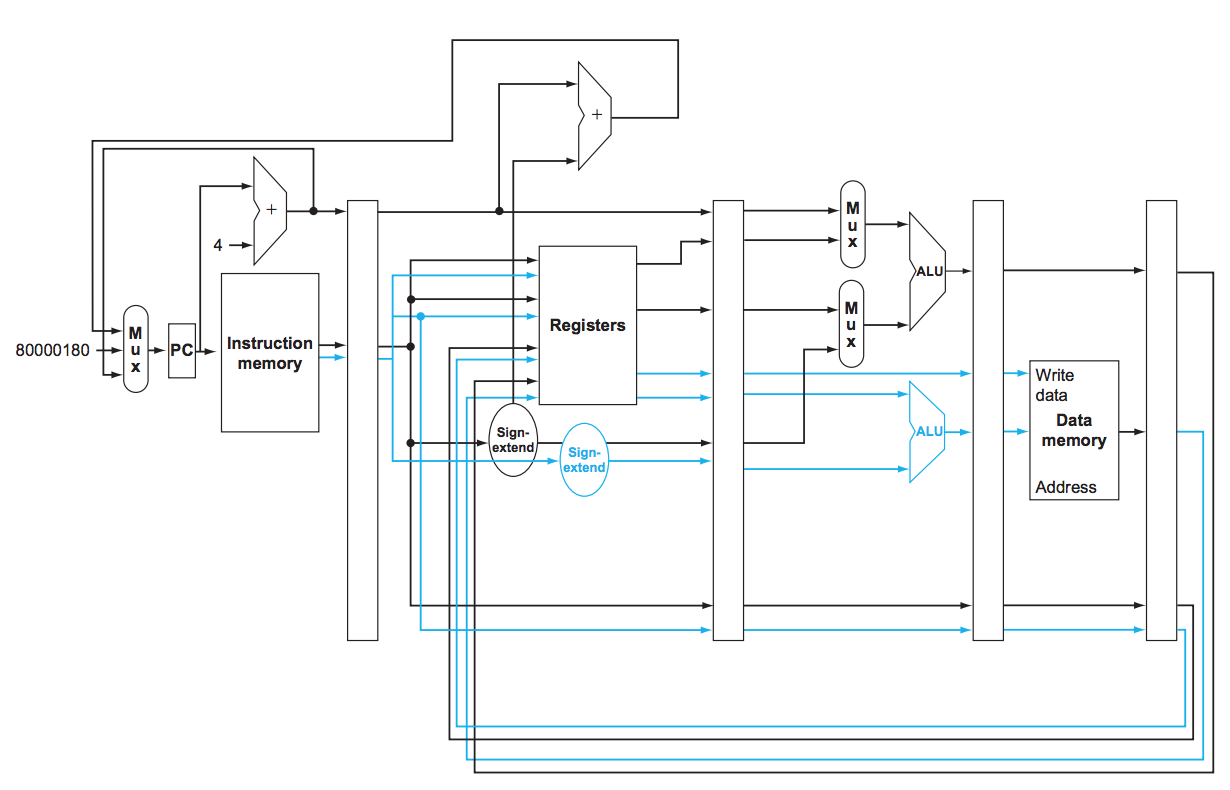 在控制冒险中我们讨论了分支,此外还有异常和中断。在x86中异常和中断统一称为中断,不过有些体系结构将控制流中任何意外的改变成为异常,将外部引起的称为中断。对于异常的处理,一般通过异常程序计数器(EPC)保存异常指令的地址,然后将控制权交给操作系统,操作系统从EPC中获取指令地址,通过状态寄存器来获取异常原因并执行相关操作,操作完成后可以决定继续执行还是结束程序。另外一种方法是向量中断,针对不同的异常定义不同的向量地址,出现异常时将控制权被转移到有异常原因决定的地址处。