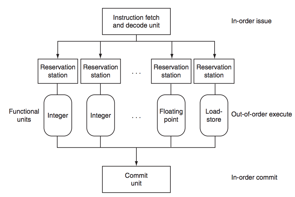 实际上许多超标量处理器扩展了基本的动态发射决策,将动态流水线调度也包含在内。在这种处理器中,流水线可以简单划分为三个主要单元:取指和发射单元、多个功能单元和一个提交单元。图8是这种模型的描述。第一单元译码后将指令发射到对应的功能单元。每个功能单元都有自己的缓冲区(保留站),用来保存操作和操作数。当缓冲区包含了所有的操作数,并且功能单元空闲,那么就可以计算该操作的结果。得到结果后,将其发送到相关的保留站和提交单元。提交单元缓存结果,并且在确认正确后将结果写回寄存器堆和存储器。提交单元的缓冲区一般称为重排序缓冲区,它可以用来提供操作数,类似于流水线的旁路。